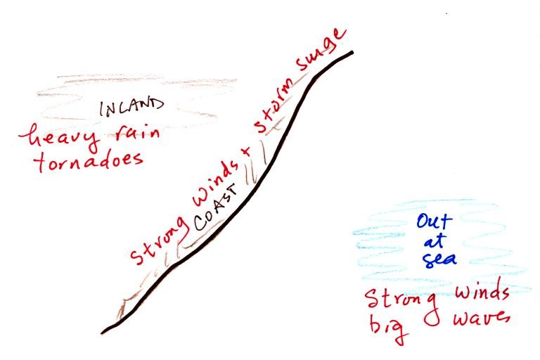 A ring of strong thunderstorms, the eye wall, surrounds the eye.