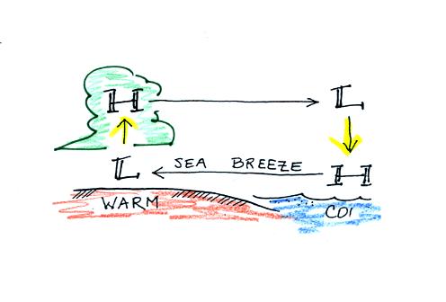 pressure and rising air is found in the E. Pacific (the reversal in the