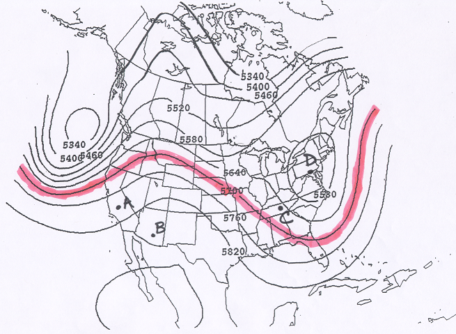 The contour maps of 500 mb height are interpreted in the same way as topographic maps of ground surface elevation. The line highlighted in pink on the sample map is the 5700 meter contour line. The height of the 500 mb surface is 5700 for all points along the line. Above (or generally north) of the line the 500 mb heights are lower than 5700 meters and below (or generally south) of the line the 500 mb heights are higher than 5700 meters. I expect that you can determine the 500 mb height at any point on a map like this. Four points A - D are marked on the map. Point A is located about halfway between the 5760 m line and the 5820 m line, so a good estimate of the 500 mb height at that point would be 5790 m. Point B marks the location of Tucson. All we can say here is that the height at point B is greater than 5820 m, but less than 5880 m. The contour lines on these plots are spaced every 60 m. Point B is definitely higher than 5820 m, but is not enclosed by a 5880 m line. Point C is located between the 5640 m and 5700 m lines, but much closer to the 5640 m line, so the height at point C is about 5650 m. Point D is located in the center of a closed low (described below). The 500 mb height at point D is certainly lower than 5580 m, but not at low as 5520 m, since that contour does not show up within the closed low.