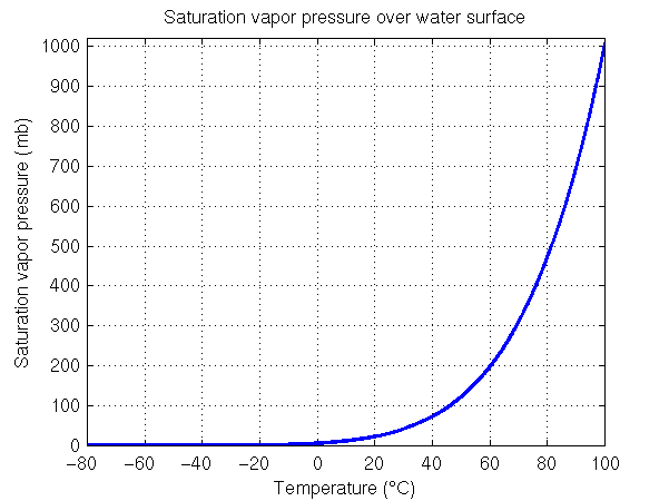 The figure on the left shows the saturation vapor pressure for water for the range of temperatures typical at the surface of the Earth. Note from the figure caption that a temperature increase from 10°C to 30°C (50°F to 86°F), which can happen over the course of a day, causes the saturation vapor pressure to increase by a factor of three and a half, from 12 mb to 42 mb. Thus a small change in temperature results in a large change in the saturation vapor pressure or the maximum amount of water vapor that can exist in the air. It is important to understand that saturation vapor pressure (or the maximum amount of water vapor that can be in the air) increases exponentially as temperature increases.
