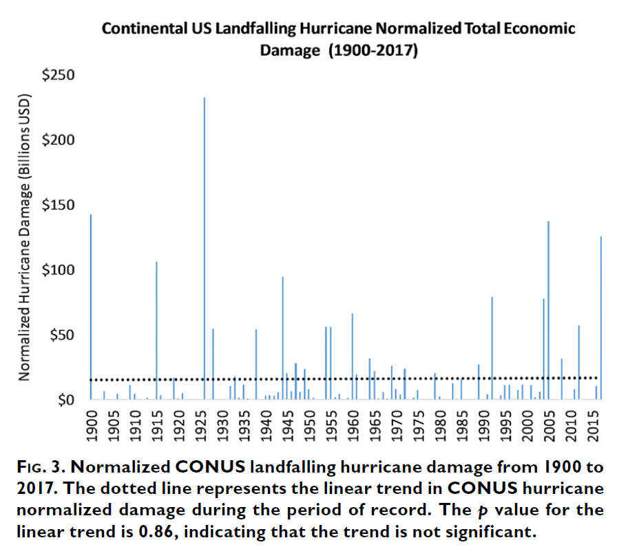 Jessica Weinkle is the lead author of another updated study published in December 2018 in the journal Nature Sustainability, Normalized hurricane damage in the continental United States 1900 - 2017 that comes to the same conclusions. Below are a couple of excerpts from the conclusion of the paper.