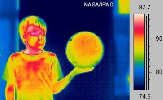 More specifically the rules above can be written as mathematical equations, that is, given the temperature of an object, the rate of photon emission over the entire range of photon energies can be computed. We can also work backwards: by measuring the radiation energy emitted by an object, we can determine its temperature. For example, if I point an infrared detector toward you, I will measure radiation characteristic of a 98°F object. If I point the detector at a colder wall in the room, I will measure less radiation energy, which is the amount characteristic of an object with a temperature of about 75°F. Because the infrared detector is measuring radiation emitted by objects on Earth (rather than normal vision which works by seeing visible light that is reflected from an object), the infrared detector can sense the difference between you and the cold wall even in the dark. This is how military night vision works. The presence of people (at night) can be detected by measuring the higher amount of infrared energy emitted by warm bodies compared to colder surroundings. Differences in the infrared energy measured are then displayed as a false color visible images that can be seen by human eyes. The two figures below are false color infrared images. One before the boy bounces a ball and one after the ball has been bounced. Because the ball gets hotter after being bounced it emits more infrared radiation. The scale on the right relates the displayed false color with temperature. Similarly, the temperature of the Earth can be determined by satellite measurements of infrared radiation emitted from the surface of the Earth and the atmosphere.