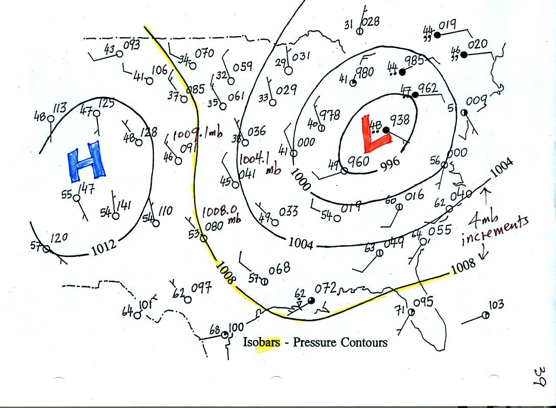 Isobars are generally drawn at 4 mb intervals. Isobars also connect points on the map