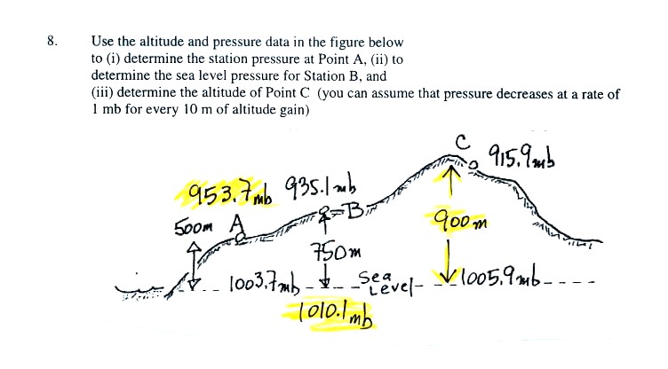 In A: Multiply 500 m by the 1 mb/10 m rate of change. You