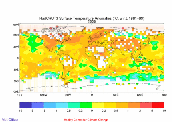 While there are arguments about how much global average temperature has increased over the period of the instrumental record, most everyone agrees that global average temperature has increased. One more point to make in this section. While we often talk in terms of global average temperature changes, keep in mind that there will be variation in the temperature changes at regional scales and over seasonal and yearly timescales at a particular location. It is important to understand this when considering the potential impacts of the temperature changes. As an example, the figure below shows the temperature differences for the year 2006 compared to the 1961-1990 average temperature. Even though the average global temperature for 2006 was about 0.4°C higher than the 1961-1990 average, note that some regions of the world showed much larger warm anomalies (over 4°C in some areas), while other regions actually had lower than aveage temperatures (over 1°C in some areas) for the year 2006. This again shows that even if the global average temperature goes up, there will be quite a bit of variability expected at regional spatial scales.