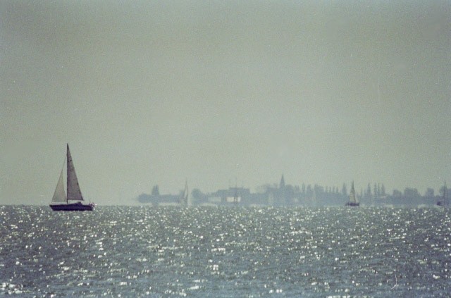 Here tree and buildings on a distant shore line appear taller than