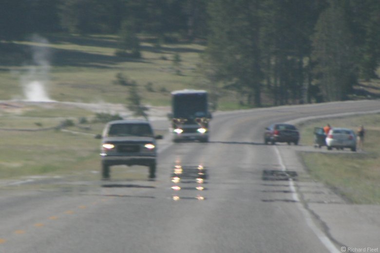 either side of the road. Light from the sky is being refracted