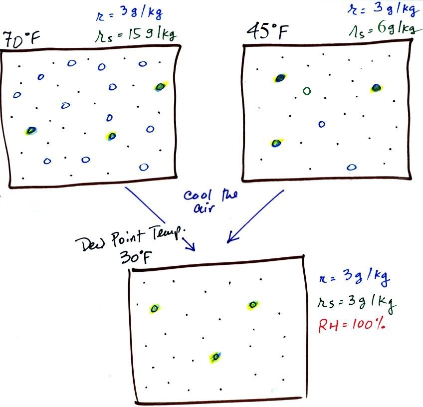 Something important to note: RH doesn't really tell you how much water vapor is actually in the air.  The two volumes of air above contain the same amount of water vapor (3 grams per kilogram) but have different relative humidities.  You could just as easily have two volumes of air with the same relative humidities but different actual amounts of water vapor.