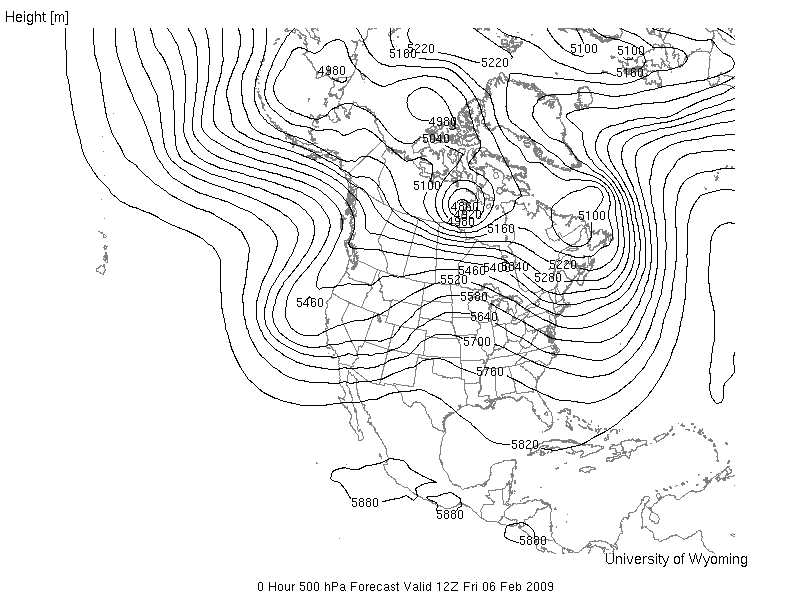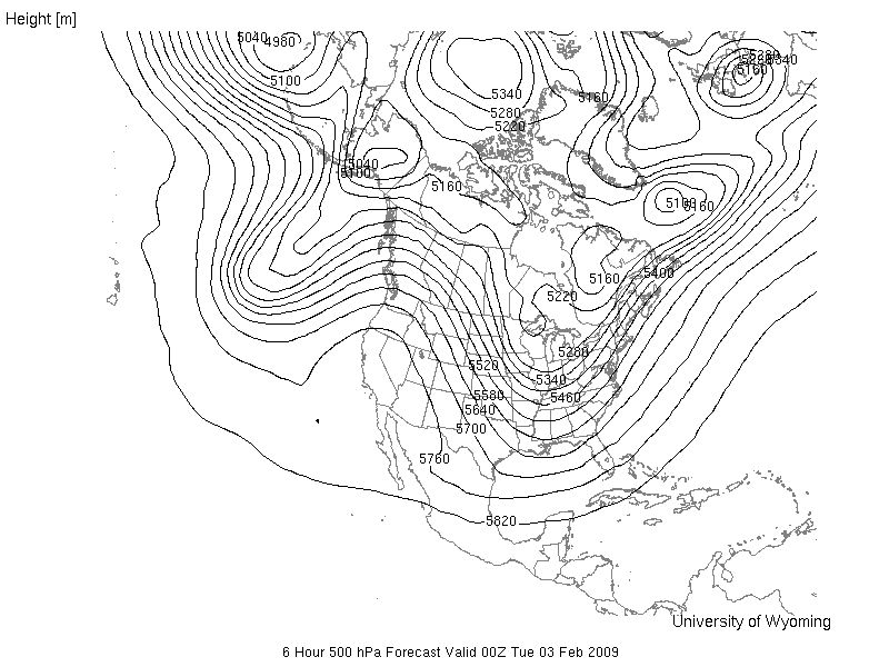 **There seems to have been a problem with the US national forecast center in getting out the initialization maps for 00Z Tuesday, February 3. We will have to use the next best verification available, a 6 hour forecast valid for 00Z Tuesday, February 3. It is very unlikely that the true map would be much different from this one.