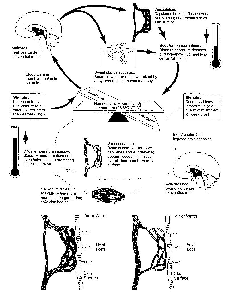 Control systems maintain a balance in the biophysical and biochemical functioning of the body. An important system is thermoregulation, which keeps the internal body temperature at a stable level in all kinds of weather.