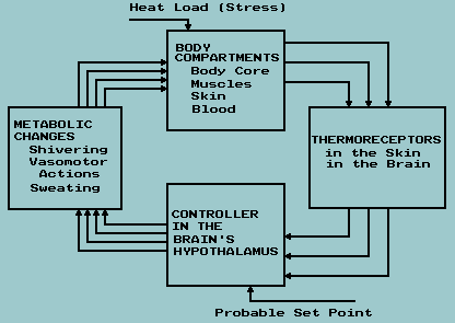 This heat stress, or load, is a disturbance of the thermoregulatory system. The disturbance can be (a) internal temperature too high or (b) internal temperature too low. The body compensates for it in the following ways:
