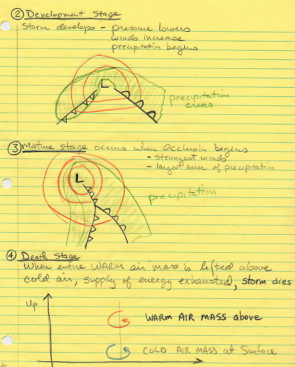 Below is a series of three links to lecture notes that I used in a previous class. It shows an idealized representation of the lifecycle of a middle latitude surface cyclone from birth to death. The last page shows the energetics involved. Weather fronts are sloped in the vertical so that warm air is always lifted above colder air. This should help you to understand the precipitation patterns shown in the links below. Don't be concerned about the occluded front, just realize that it also forces lifing of air.