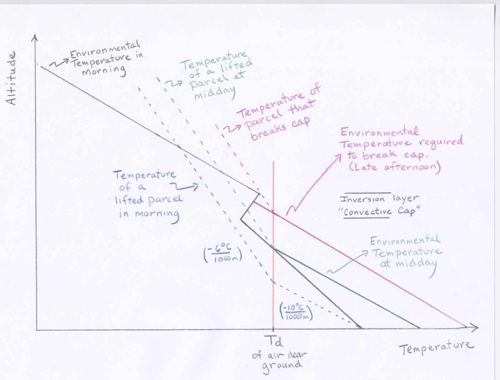 The existence of the mid-level convective cap, which will be referred to as an inversion layer, is a key ingredient. An inversion layer is a layer in the atmosphere where the temperature increases with increasing height. Recall that typically temperature decreases with increasing height. An inversion layer is extremely stable for rising motion. At first an inversion layer will inhibit thunderstorm formation because rising parcels from the surface will not be able to penetrate through this layer. However, as the day progresses and the atmosphere gradually warms from below the inversion layer erodes away, and surface parcels become warm enough to "break through" the old inversion layer and reach the unstable atmosphere above. All day the sun's energy was used to heat the lower atmosphere and increase the water vapor content by evaporation essentially adding more energy to the lower atmosphere. When parcels are finally able to "break through", it is like blowing the lid off of a pressure cooker. This is depicted graphically on this convection cap page from USA Today An illustrative diagram of a convective cap will be drawn in lecture. Click here to view the diagram.