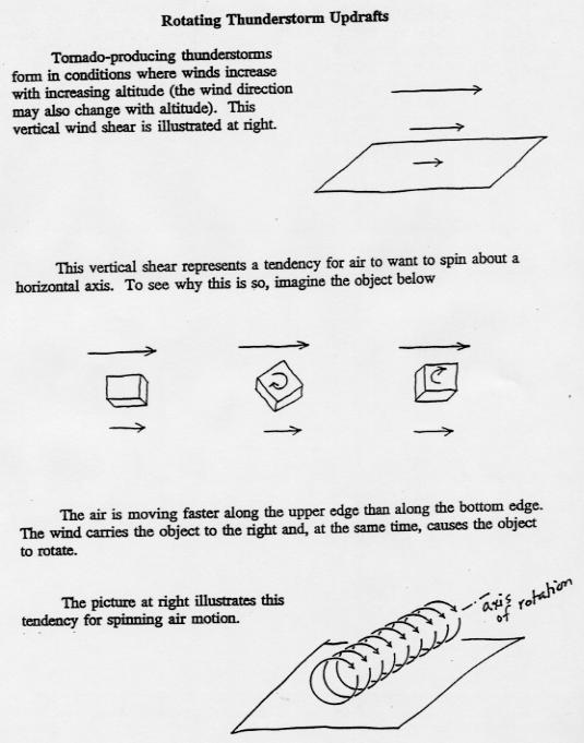 There seem to be several mechanisms that can lead to tornado formation, none of which are fully understood. One proposed mechanism of tornado formation involves rotating thunderstorm updrafts. The two pages listed below will also be distributed as part of an in-class handout. ( formation page 1, formation page 2). The mechanism described on the pages above is probably not the mechanism typically responsible for tornado formation in supercell thunderstorms, though. The proposed explanations for tornado formation in supercells is too complex to cover in this class.