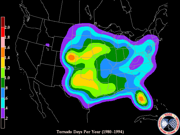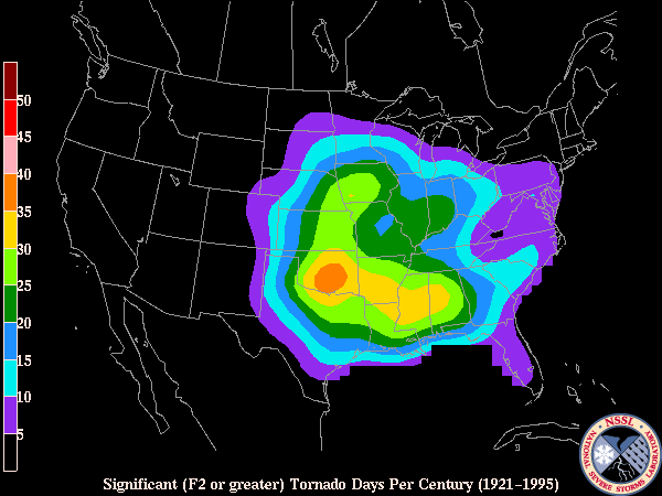 | Tornado days per year (All tornadoes) | Significant (EF-2 or stronger) Tornado days per century | Violent (EF-4 or larger) Tornado days per millennium |