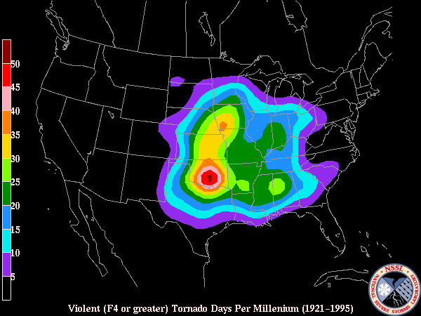 The three figures on below display where tornadoes of differing strengths are most common in the United States. Click on the thumbnails to see larger image. The EF scale is defined in the next section.