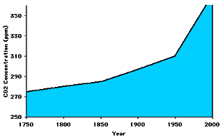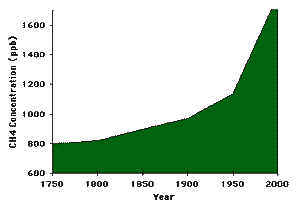 | Carbon dioxide concentration (ppm) 1750-1998 | Methane concentration (ppb) 1750-1998 |