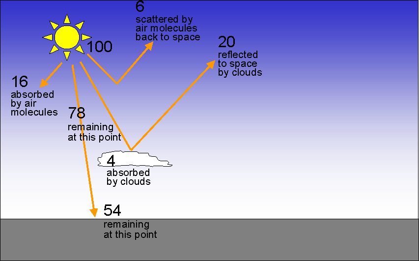 | On a worldwide, long-term average, air molecules absorb 16% of the incoming energy from the Sun and reflect another 6%. Clouds absorb 4% of the incoming energy from the Sun and reflect 20%. Therefore 54% of the incoming energy from the Sun is transmitted through the atmosphere and hits the Earth's surface. |
