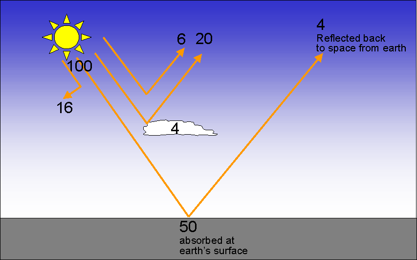 | Complete solar portion of the Earth's energy budget. 4 of the 54 units are reflected back to space. Therefore, the 50 units left must be absorbed by the Earth's surface. |