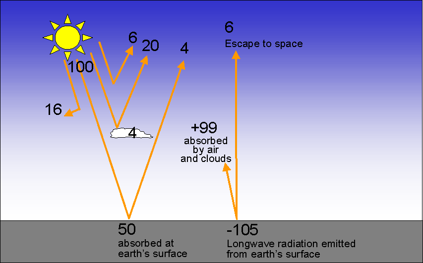 clouds absorb 99 of the 105 units emitted by the Earth's