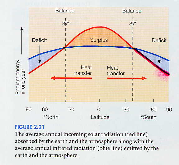is a surplus of radiation energy (solar radiation absorbed > radiation emitted to space) to the