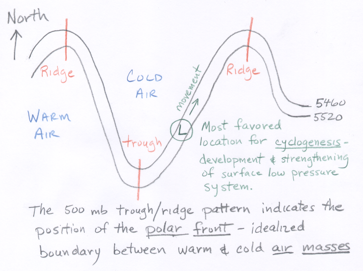 The position of the polar front (or warm/cold boundary) is not fixed but moves south and north within the middle latitudes in the winter. We have already seen evidence for this in the 500 mb height patterns. In 500 mb troughs, the polar front moves south as cold air masses plunge southward and in 500 mb ridges, the polar front moves northward as warm air masses push northward.