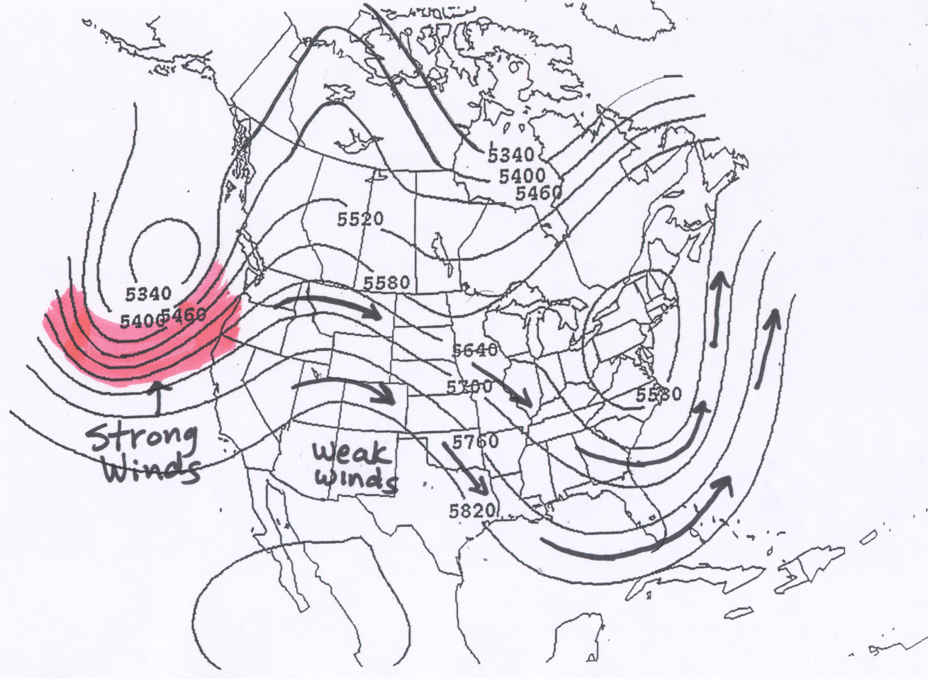 The wind speed is faster where the height lines are closer together, and slower where the height contours are spaced further apart. If this helps, you can think of the 500 mb height lines as channels through which the air moves. The wind follows the wavy pattern of the lines, and gets squeezed together where the lines get closer together, resulting in faster winds. This is just how water would flow in a hypothetical channel. A few examples are included below.