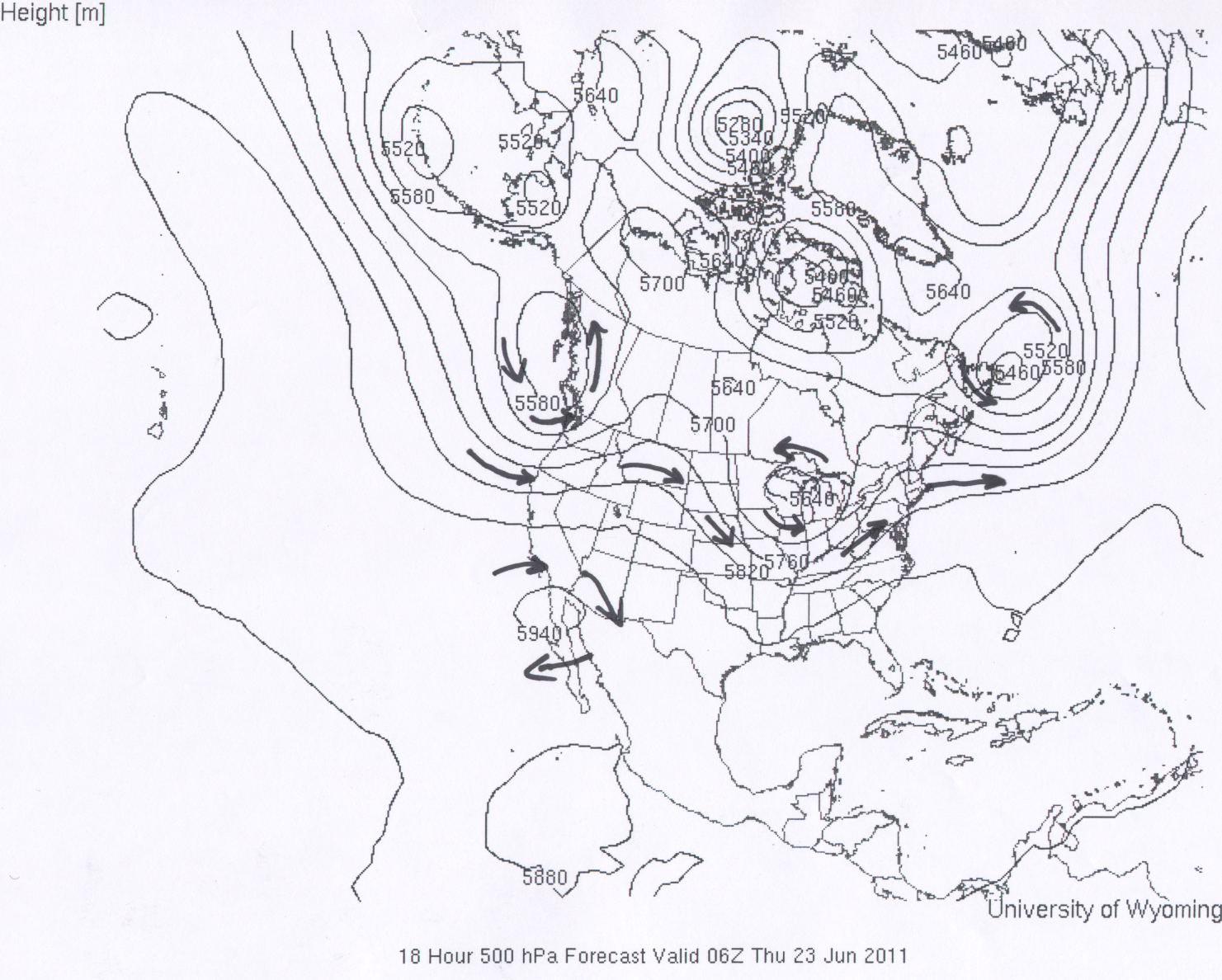 This is somewhat simplistic and will not always give you all the details of where it is and is not raining. One problem mentioned above is that the 500 mb height map does not contain any information about the amount of moisture or water vapor that is present in the atmosphere. Therefore, even a strong trough, which forces strong upward air motions, may not produce any precipitation (or even clouds) if there is not enough water vapor in the air. In fact it is fairly common here in the desert to have troughs move through without much in the way of clouds or rain. Since this is not strictly a weather class, we do not have time to cover details like this. The use of 500 mb maps allows you to make a quick (and often decent) assessment of the large-scale temperature and precipitation patterns.