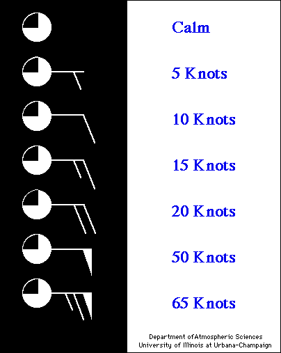The final bit of information on the skew-T diagram is the wind information shown along the right side of the diagram. The "wind barbs" indicate both the wind speed and wind direction at the corresponding air pressure and altitude. The wind barb points in the direction from which the wind is coming, with respect to standard compass directions. For a wind from the north the barb sticks straight up, from the east the barb points right, from the south the barb points straight down, and from the west the barb points left. For example the circled wind barb indicates that the measured wind at 200 mb was from the northeast. Wind speed is indicated by the line segments and flags attached to the end of the barb. There are long and short line segments. Each long line segment represents 10 knots of wind (there can be up to 4 long line segments). A short line segments represents an additional 5 knots of wind. For example the circled wind barb indicates a wind speed of 20 knots, whereas the wind barb directly below the circled wind barb indicates a wind speed of 15 knots. Each Flag on a wind barb represents 50 knots of wind speed. In the example all of the winds were too light to need a flag. A legend for wind speed is shown below on the right. (By the way a knot is a nautical mile per hour. 1 knot = 1.15 miles per hour). (See Figure D for further explanation)