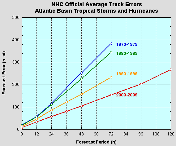 | Figure 6: Official Track Errors for Atlantic Ocean Tropical Storms and Hurricanes by decade (source NHC) (n mi = nautical miles, where 1 n mi = 1.15 mi) |