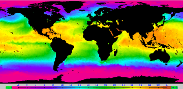 | Figure 4: Sea surface temperature map for the northern hemisphere summer. The yellow, orange, and red colors show water temperatures warm enough to sustain hurricanes (> 26.5°C). |