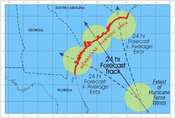 With modern techniques of forecasting and tracking hurricane paths, it is always possible to issue warnings about the "probable" locations that will be affected by any given hurricane. Although hurricanes can be easily tracked using satellite data, predictions of their future movement and intensity are by no means certain. Based on the estimated uncertainty in future hurricane movement, hurricane watches and warnings are issued for a wide swath as shown in Figure 7. The National Hurricane Center defines hurricane watches and warnings as follows: