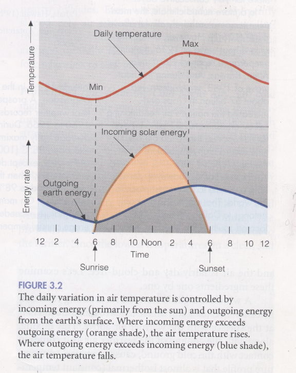 By the way, there is also a lag each day between the time of maximum solar heating (solar noon) and the time of the high temperature, which usually happens in the late afternoon (2:30-4:30 PM). Even though heating is maximum at noon, energy input from the sun remains greater than energy output (mainly in the form of radiation energy lost by the Earth) until late afternoon each day (see this figure showing typical daily temperature changes taken from Ahrens, Essentials of Meteorology, third edition).