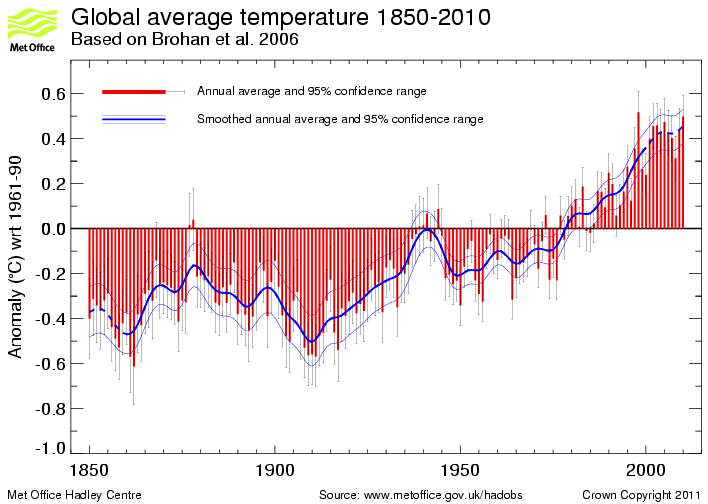 The figure below shows one reconstruction of the changes in global average temperature based on actual temperture measurements. According to the figure, the global average surface temperatures on Earth have risen by about 0.8°C (1.4°F) since 1850. The red bars indicate the global average temperature each year relative to the average temperature over the period 1961-1990. Thus, the plot shows the difference in temperature between each individual year and the 1961-1990 average. The blue line is a smoothed version of the plot drawn to highlight trends in temperature. There is some uncertainty in determining global average temperatures from the available measurements due to instrumental errors, changes in instrumentation over the record, changes in the local environment surrounding the thermometers, and the fact that measurements are quite sparse over some areas of the world, but even the most conservative estimates indicate that the surface temperature has risen at least 0.5°C (0.9°F) since 1850.