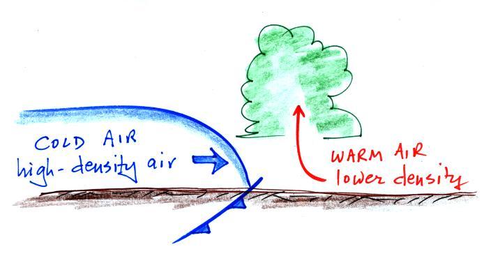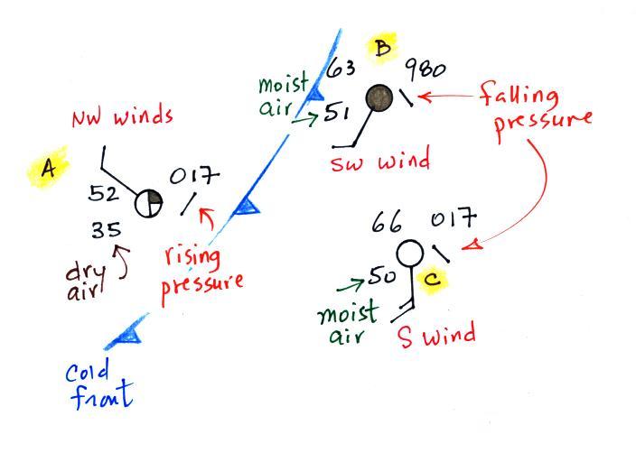 The air ahead of the front (Pts. B & C) is warm, moist,