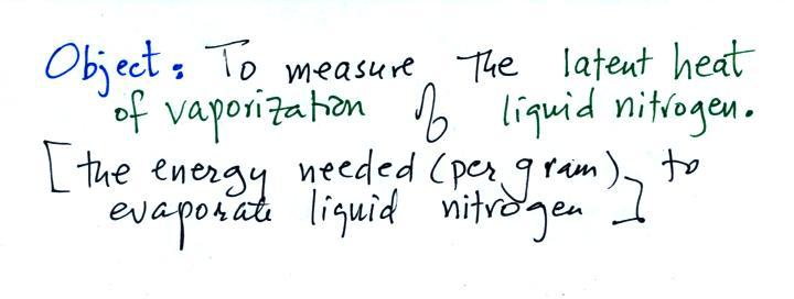We know the mass of the nitrogen that we started with and that was eventually evaporated (47.0 g) and the mass of the water (155.7 g).  We measured the ΔT (15.5 C) and we know the specific heat of water (1 cal/g C).  We substitute them into the equation above and solve for LH, the latent heat of vaporization of liquid nitrogen.  Here are the details of the calculation: