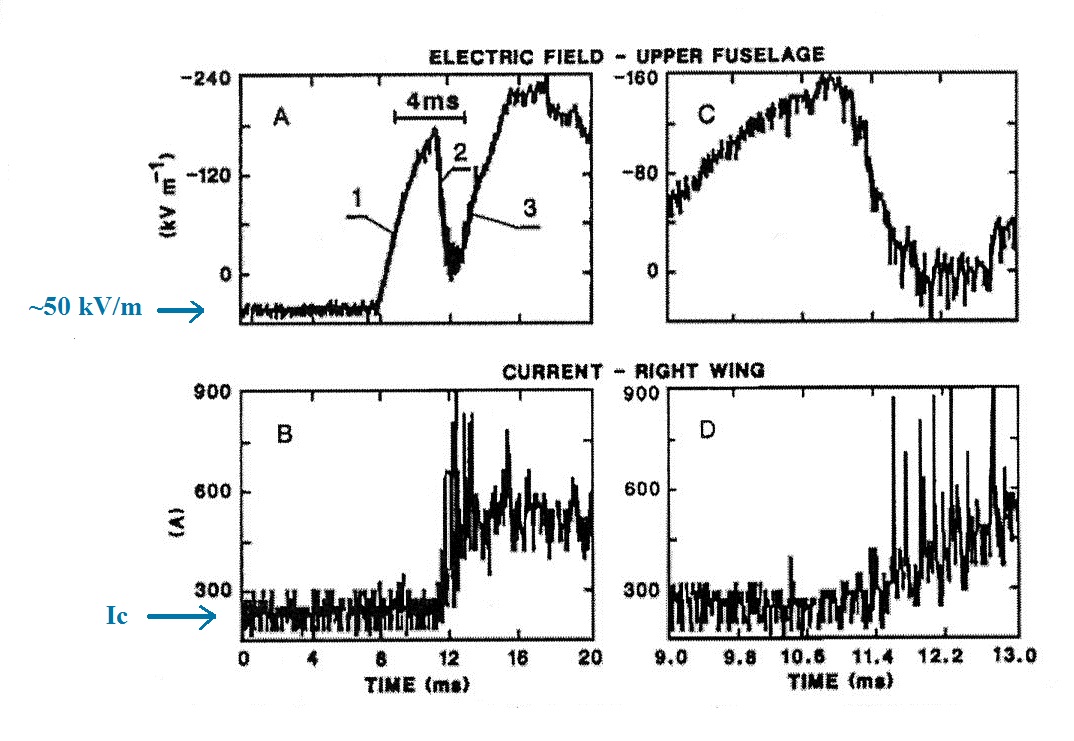 1964-1966 US Air Force Cambridge Research Laboratories "Rough Rider Project" used an F-100F aircraft (a 2 seat trainer version of the F-100, I believe) studied thunderstorms in Florida Data obtained from 49 lightning discharges the recording system may not have had sufficiently fast time response to accurately determine current rise time and peak dI/dt values |