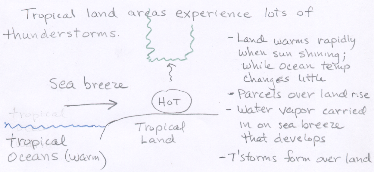 Thunderstorms form from the equator to as far north as northern Alaska and Siberia. Thunderstorms are most common over land areas in and near the tropics, with the global hot spot over central Africa. Tropical regions receive intense sunshine all year round, and the heating contrast between the land and ocean surface causes warm unstable air over land to rise up and form thunderstorms (see this hand drawn diagram.) Thunderstorm formation over tropical oceans far from land areas is less frequent because ocean surfaces do not warm as rapidly as land surfaces. In general, thunderstorms are more common over land areas and over oceans adjacent to land than over the oceans far from land. Outside the tropics, thunderstorm formation is more seasonal occurring most often in those months where heating from the sun is most intense (late spring through early fall). While tropical areas do produce the most thunderstorms per year, the most common place for severe thunderstorms is in the middle latitude regions of the Earth. In these regions, warm moist tropical air can mix with cold polar air, which sets the stage for severe thunderstorms.