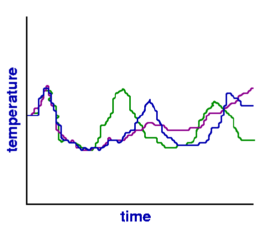 | Simple representation of model sensitivity to initial conditions. Suppose we are just looking at the model forecast of temperature for a single location. The three different colors represent forecasts made using the same model, but with slightly different initial conditions. Over the short-term all three model runs make about the same forecast. But at longer forecast times, the three predictions diverge from each other. |