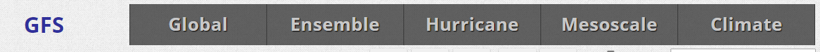 The first step is to specify the numerical forecasts maps that you want to view. The instructions that follow describe how to produce maps of the 500 mb height anomaly. The top banner on the Tropical Tidbits model page is shown below. The bold GFS on the left indicates the selected model. To select between GFS and ECMWF, click on "Global" button and make a selection from the drop down menu. For this class we are only going to consider the GFS and ECMWF models. There are many other model selections available from all of the five drop down menus if you would like to play around with looking at output from other models.