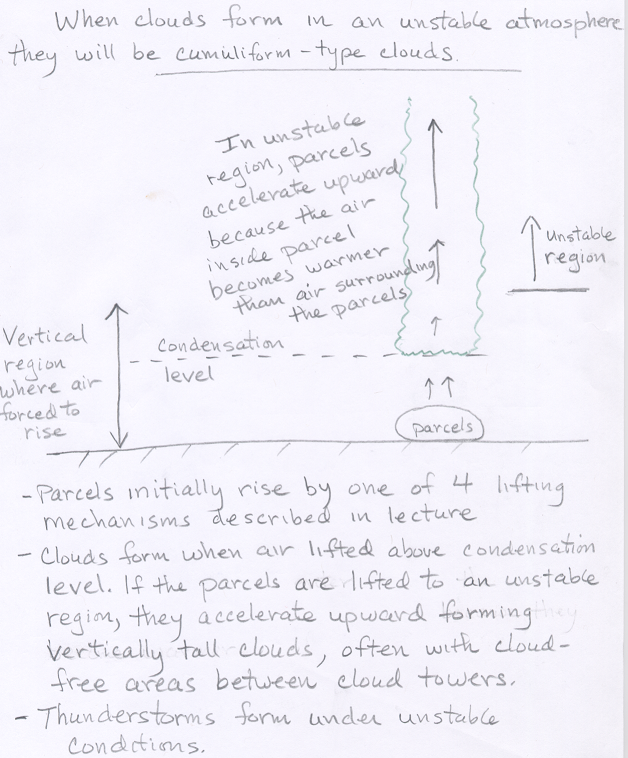 When the atmospheric is unstable, time-lapse videos of developing clouds can be quite interesting. The videos placed under the link below are quite large (file size), and if you cannot view them that is ok. I suggest looking at the one dated 20070823 as a good example of a day when it was unstable and storms formed. Once parcels are pushed up to the level where they become unstable, they accelerate upward, trailing towers of cumulus clouds.