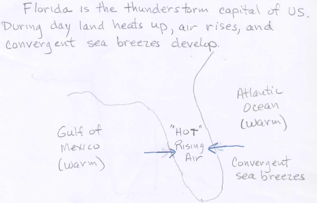 Thunderstorms form from the equator to as far north as northern Alaska and Siberia. Thunderstorms are most common over land areas in and near the tropics, with the global hot spot over central Africa. Tropical regions receive intense sunshine all year round, and the heating contrast between the land and ocean surface causes warm unstable air over land to rise up and form thunderstorms (see this hand drawn diagram.) Thunderstorm formation over tropical oceans far from land areas is less frequent because ocean surfaces do not warm as rapidly as land surfaces. In general, thunderstorms are more common over land areas and over oceans adjacent to land than over the oceans far from land. Outside the tropics, thunderstorm formation is more seasonal occurring most often in those months where heating from the sun is most intense (late spring through early fall). While tropical areas do produce the most thunderstorms per year, the most common place for severe thunderstorms is in the middle latitude regions of the Earth. In these regions, warm moist tropical air can mix with cold polar air, which sets the stage for severe thunderstorms.