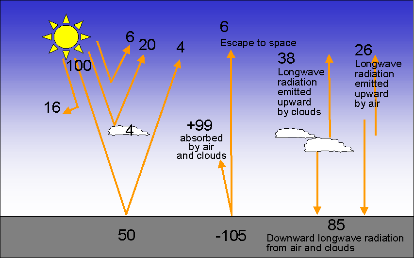 First let's add the outgoing Earth radiation on the same diagram as the solar energy input. All of the energy units shown have been normalized, such that 100 units is the amount of radiation energy from the Sun that hits the top of the atmosphere. Upward longwave (infrared) radiation emitted from Earth's surface is largely absorbed by clouds and atmospheric greenhouse gases. Some, however, escapes directly into space. In normalized units, the Earth's surface radiates 105 units of infrared energy upward. Atmospheric gases (water vapor, carbon dioxide, and other greenhouse gases) and clouds absorb 99 of the 105 units of infrared radiation energy emitted by the Earth's surface, while only 6 units of infrared radiation energy emitted from the ground goes directly off into outer space. Greenhouse gases and clouds also emit radiation both upward (64 units) to space, which cools the planet, and downward (85 units) to warm the Earth's surface. This behavior is commonly referred as the Greenhouse Effect. The figure below shows all of the radiational energy exchanges into, out of, and within the Earth-Atmosphere system. For the entire planet, the radiation energy in equals the radiation energy out, which determines the radiative equilibrium temperature. (The numbers on the arrows that point out of the top of the atmosphere add up to 100, which equals the solar energy that comes in at the top of the atmosphere.) However, note that the Earth's surface absorbs more radiation energy than it emits, while the atmosphere emits more radiation energy than it absorbs. The surface absorbs 135 units of radiation energy, but only emits 105 units (+30 for radiation), while the atmosphere absorbs 119 units, but emits 149 units (-30 for radiation). Students: You will not be expected to know the details or memorize the numbers from these diagrams. What you should understand is the the planet Earth (as a whole) is in radiative equilibrium. You should know that the surface of the Earth absorbs more radiation energy than it emits, while the atmosphere emits more radiation energy than it absorbs.