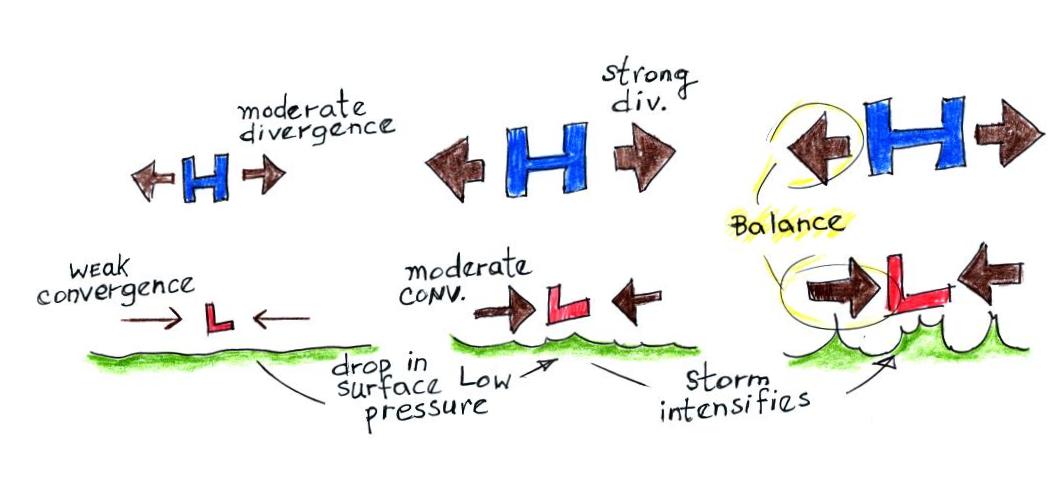 what causes both types of storms to intensify (intensification means the surface low pressure gets even lower) |