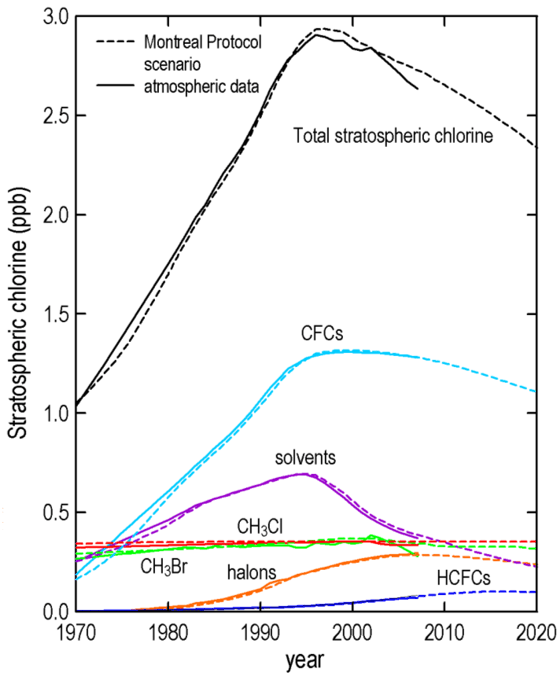 see evidence that chlorine levels in the stratosphere are decreasing (see figure above).