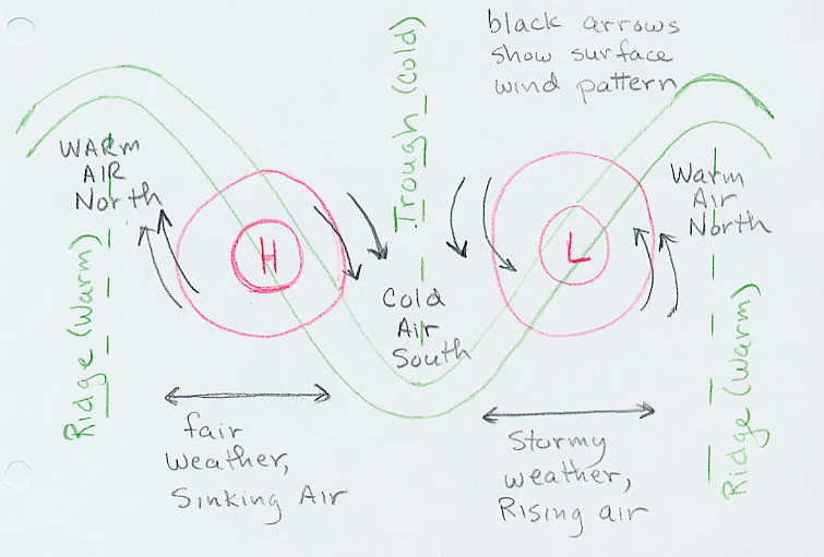 My best attempt at drawing a 3-D representation of a mid-latitude winter weather pattern is given below.