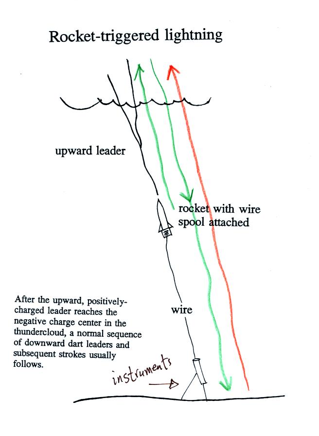 toward a thunderstorm. The rocket is connected by a thin wire to