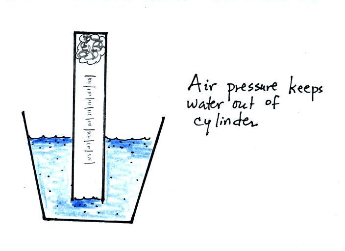 Note that it isn't that the cylinder is full of air that keeps the water out (as shown above at left), there's actually a lot of empty space in the cylinder.  Rather it is the fact that the air molecules are moving around inside the cylinder at 100s of miles per hour and they strike the water molecules with enough force that the water can't move into the cylinder.