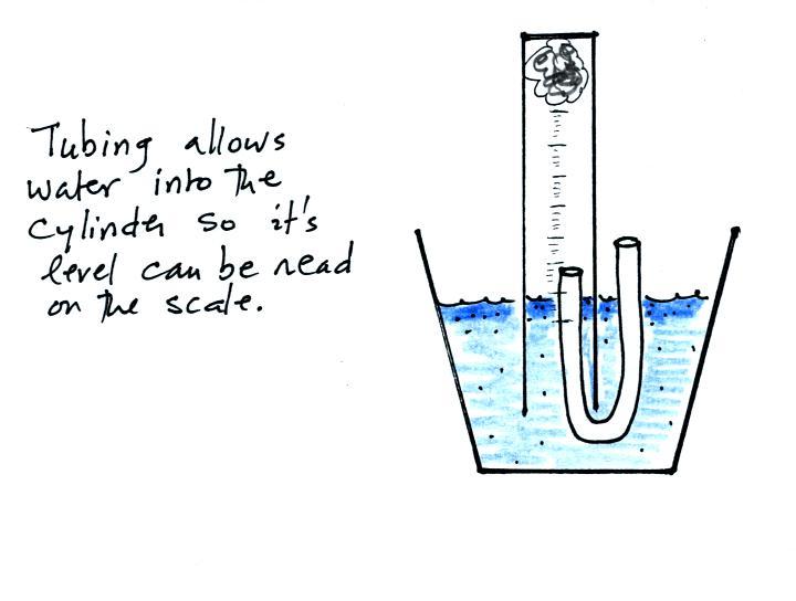 The solution to this problem is to insert a small piece of flexible tubing into the cylinder as shown above.  If you lower the cylinder into the water while keeping the two ends of the tubing out of the water, water will enter the cylinder.  When the water level can be read on the scale (ideally between the 90 and 100 ml marks), the tubing is removed.  This seals off the air sample and the experiment is underway.