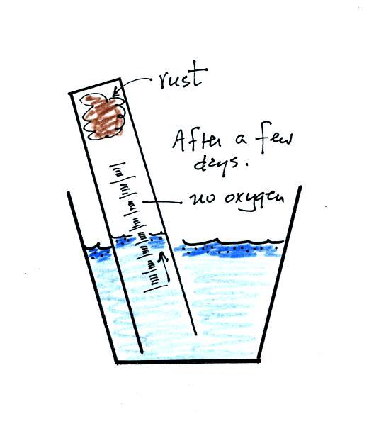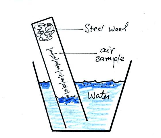 The object of this experiment is to measure the percentage concentration of the oxygen in air.  Basically a wet piece of steel wool is stuck into a 100 mL graduated cylinder.  The cylinder is turned upside down and the open end is immersed in a cup of water.  The air in the graduated cylinder is sealed off from the rest of the atmosphere.  The oxygen reacts with the steel wool to form rust and is removed from the air sample (it turns from a gas and becomes part of the rust, a solid).